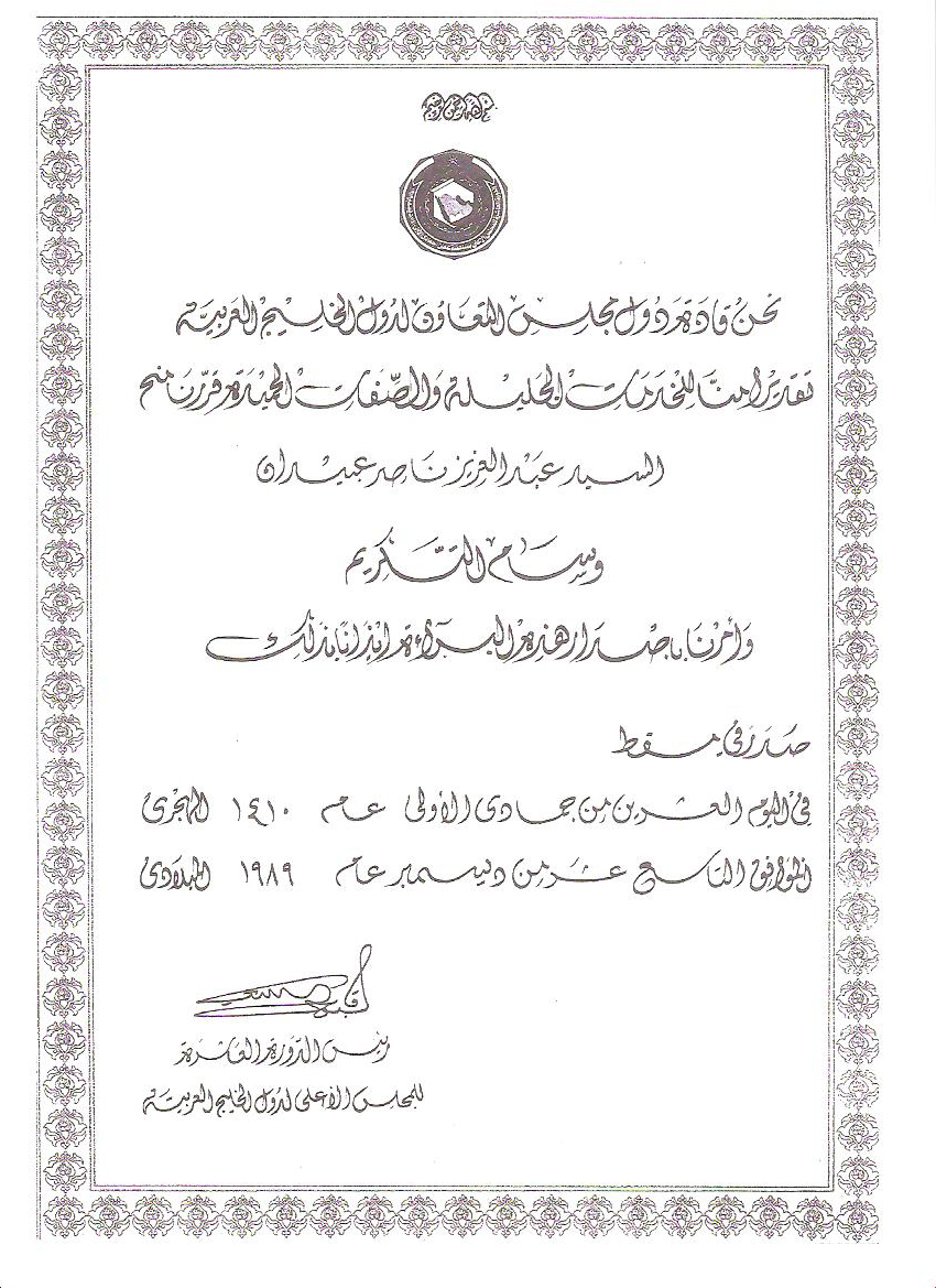 وسام التكريم للفنان الموسيقار عبد العزيز ناصر من قادة دول مجلس التعاون لدول الخليج العربي. هذا التكريم الرفيع حدث في العاصمة العمانية مسقط عام 1989، حيث اجتمع قادة وملوك دول الخليج لتكريم الرموز الثقافية والفنية التي أثرت المشهد الثقافي الخليجي.