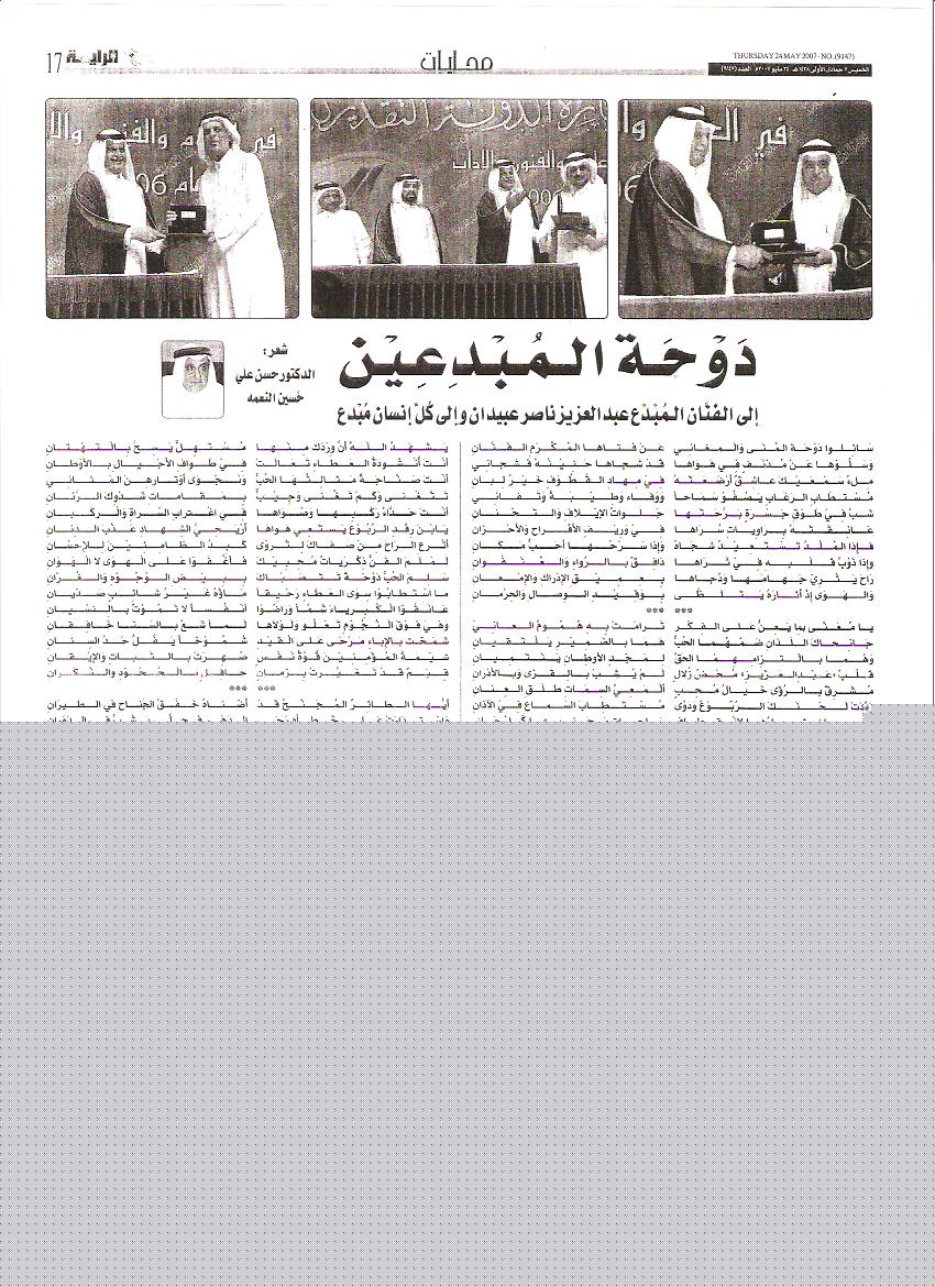شعر الدكتور حسن علي حسين النعمة إلى الفنان المبدع عبد العزيز ناصر عبدان والى كل إنسان مبدع. كلمات تحمل في طياتها تقدير الأكاديميين والمثقفين لجهود الموسيقار في خدمة الفن والثقافة العربية.